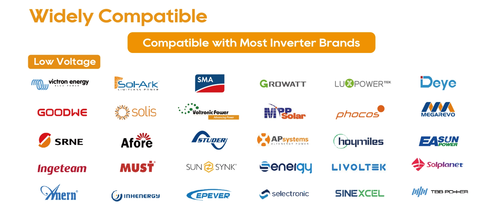 Pytes Energy의 가정용 배터리 시스템 V10의 주요 장점 중 하나는 시중 대부분의 주요 인버터와 완벽하게 호환된다는 것입니다. 또한, 저희는 Sol-Ark와 전략적 협력 관계를 맺고 있습니다. 이러한 완벽한 호환성을 통해 주택 소유주는 태양광 패널의 잠재력을 최대한 활용하는 동시에 잉여 에너지를 효율적으로 저장하고 활용하여 에너지 사용의 전반적인 지속 가능성을 향상시킬 수 있습니다.